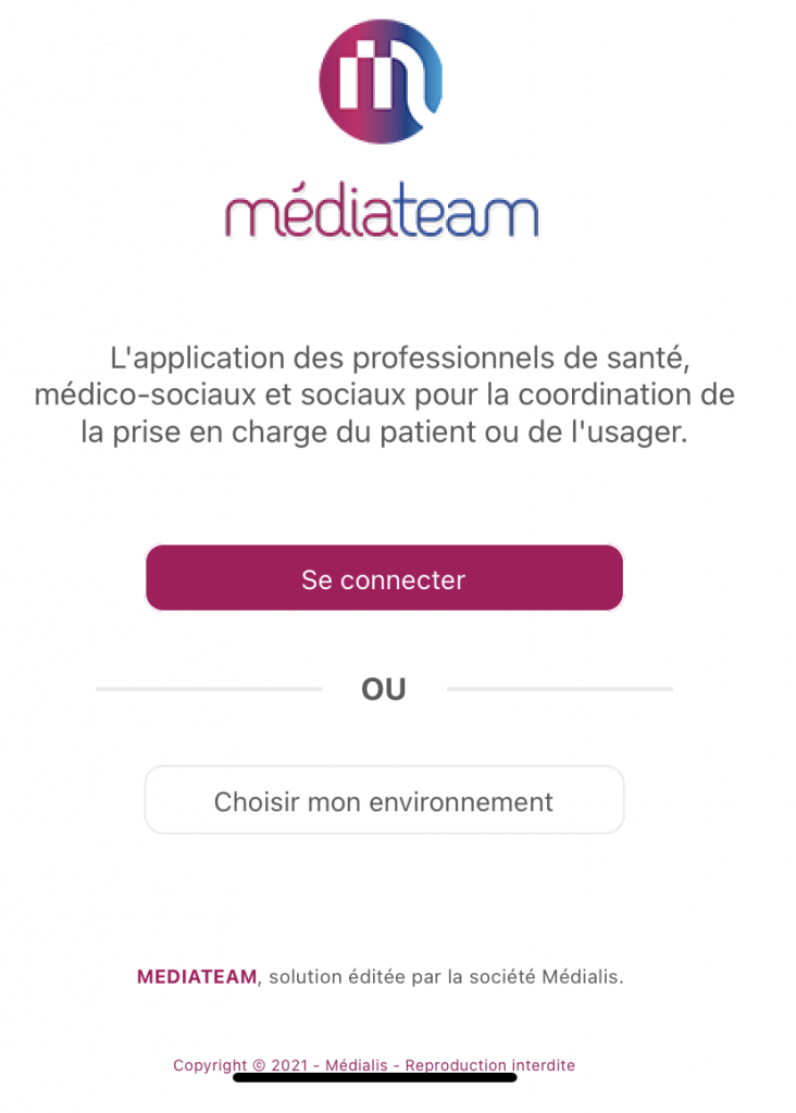 Ouvrez l’application Médiateam fraichement installée, puis appuyez sur le bouton « Se connecter » :