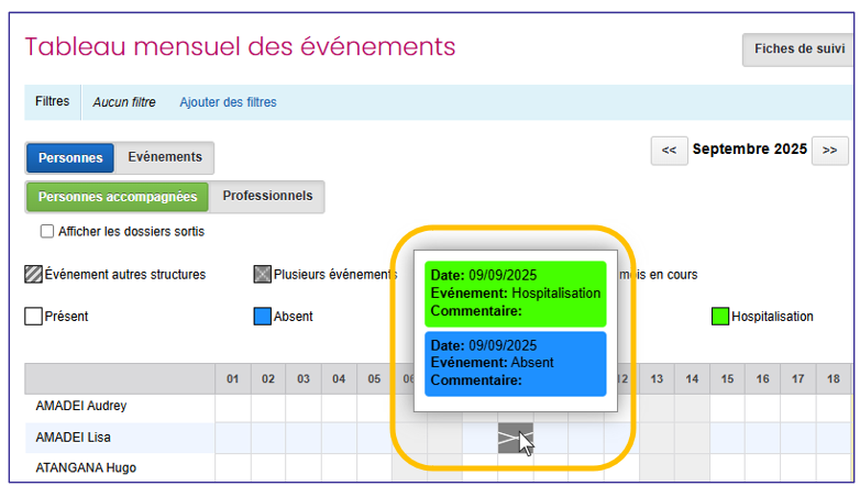 Pour faciliter la lecture du tableau, lorsqu’il y a plusieurs événements positionnés le même jour pour une personne, ceux-ci sont détaillés au survol de la case.
