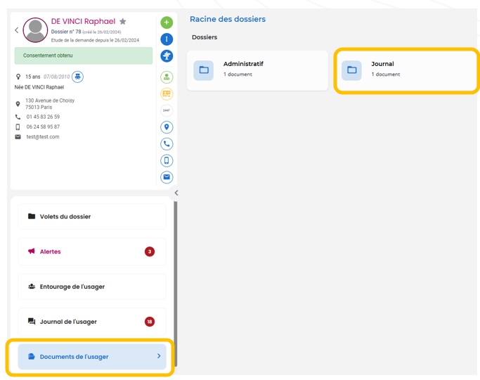 Désormais, tous vos documents issus du journal de l’usager sont disponibles dans un dossier dédié, accessible depuis la gestion documentaire de l’usager.