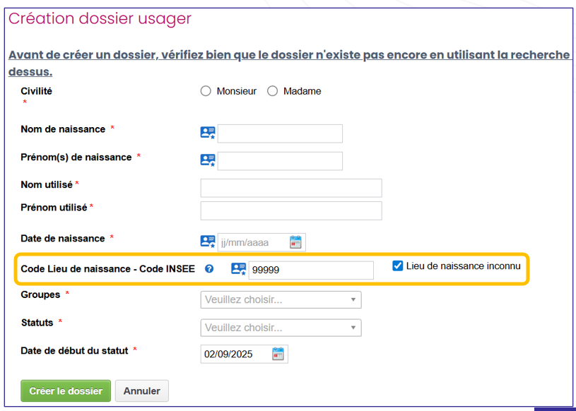 Le code lieu de naissance doit être saisi lors de la création d’un dossier.